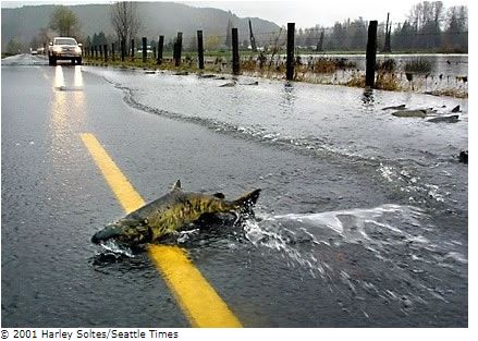 قد يبدوا لك ذلك غريبا ، وكيف للاسماك ان تقطع الطريق ، لكن هذا الامر حقيقة وليس خيال ، ففي مقاطعة " Mason " بواشنطن في الولايات المتحدة الامريكية USA ، ستجد لافتة بجانب الطريق تخبرك لانتباه للاسماك التي تقطع الطريق