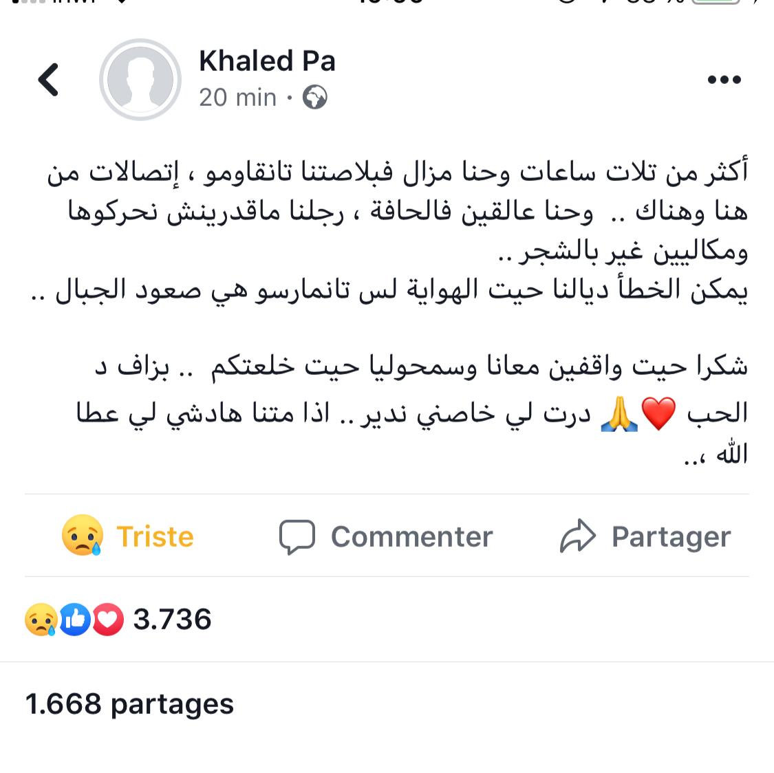 الشابين يدعيان " خالد " و " اسماعيل " كانا في رحلة تنزه واستكشاف لجبل تدغين المغطى بالثلوج ، قبل ان يظلى الطريق ، ويصاب أحدهما " اسماعيل " بنزيف جعله غير قادر على المشي ، مما جعل صديقه " خالد " يستعين بشبكة الإنترنت ، وينشر تدوينة عبر موقع فيس بوك ، مناشدا لانقاذهم من البرد القارس قبل حلول الظلام ، تلك التدوينة التي ثم تداولها من طرف العديد من مستخدمي مواقع التواصل الاجتماعي ، خاصة محبي الاستكشاف وتسلق الجبال